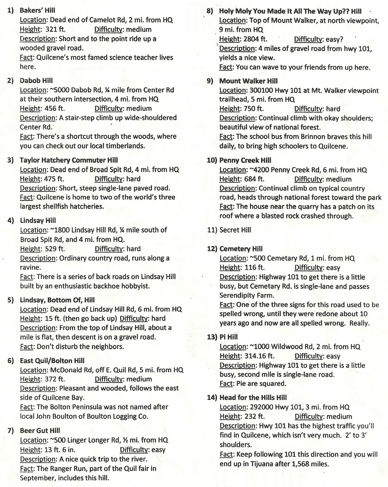 Participants may choose which and how many of the hills to ride, and how often. Elevation gains range from 20 feet to 2800 feet.
